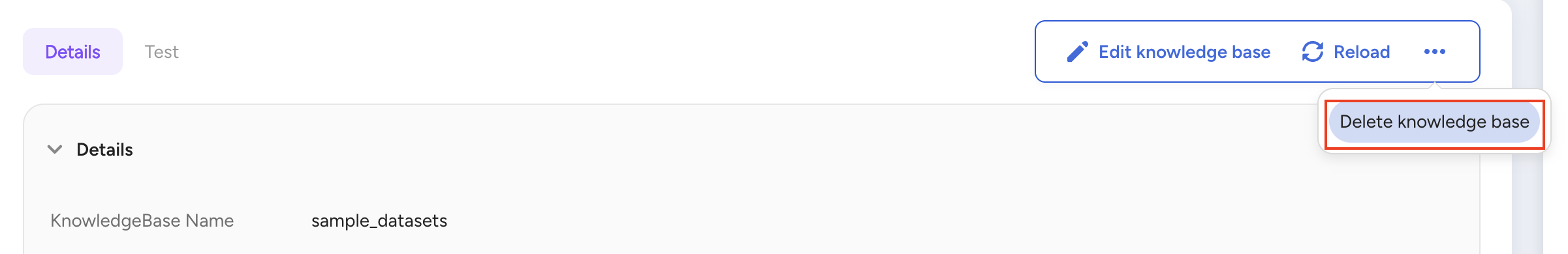 To remove a knowledge base from the AI Agent Foundry, select Delete knowledge base from the 3-dots menu.