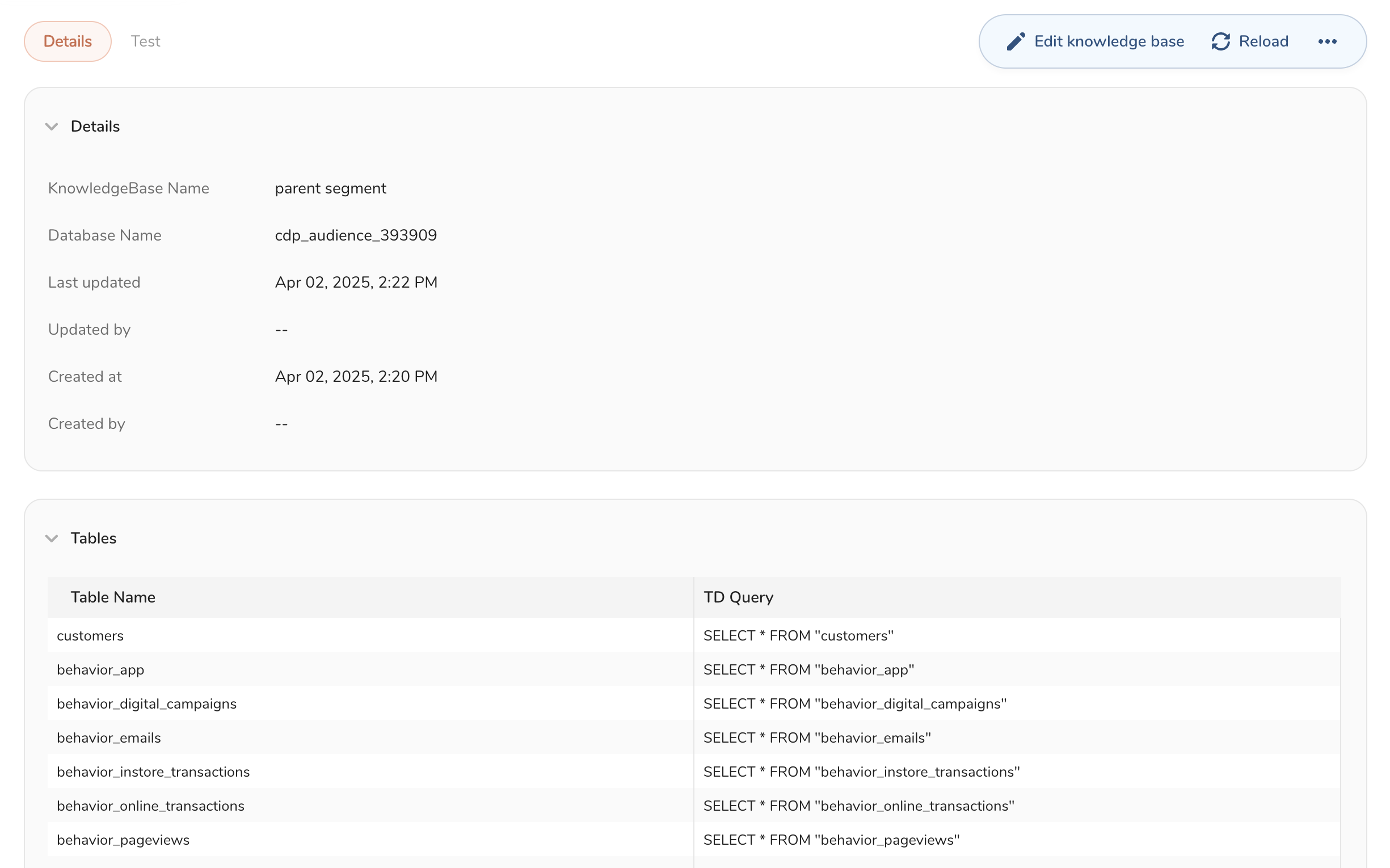 You can check the setup of your Knowledge Bases by selecting the Details tab
