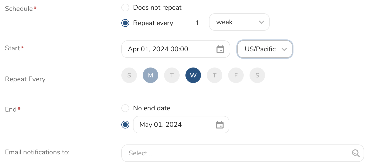 You can select a single day or multiple days of the week (including all seven days) and configure a custom start and end date.