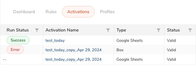 | Activation Name | The activation name. Select the link to open the activation. | Filtering |
