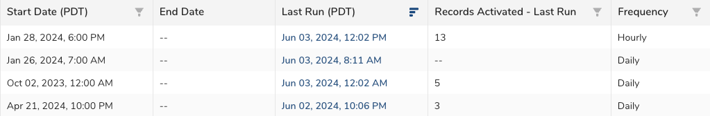| Frequency | The cadence configured for the activation schedule. | Filtering and sorting |