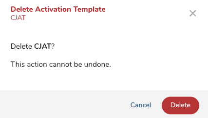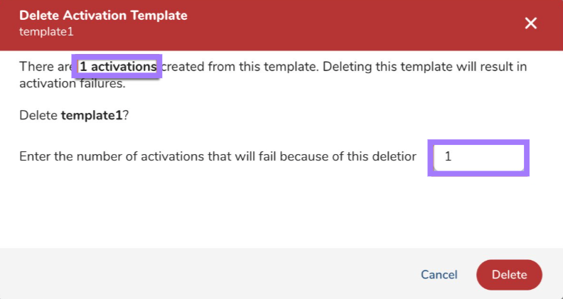 If an activation template has already been used to create activations, a message displays asking you to 'Enter the number of activations that will fail because of this deletion'. Enter the number displayed in the message and select Delete.