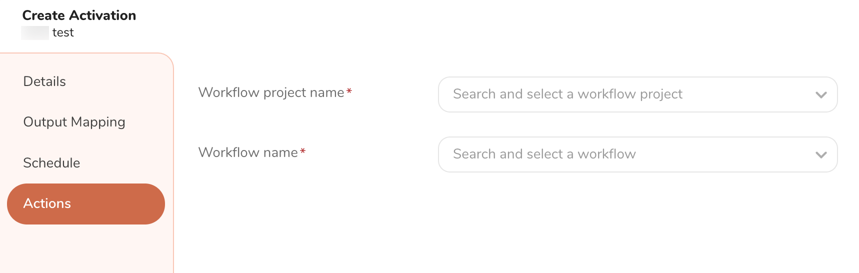 To assign the custom workflow designed for this activation, select the Workflow project name and Workflow name.