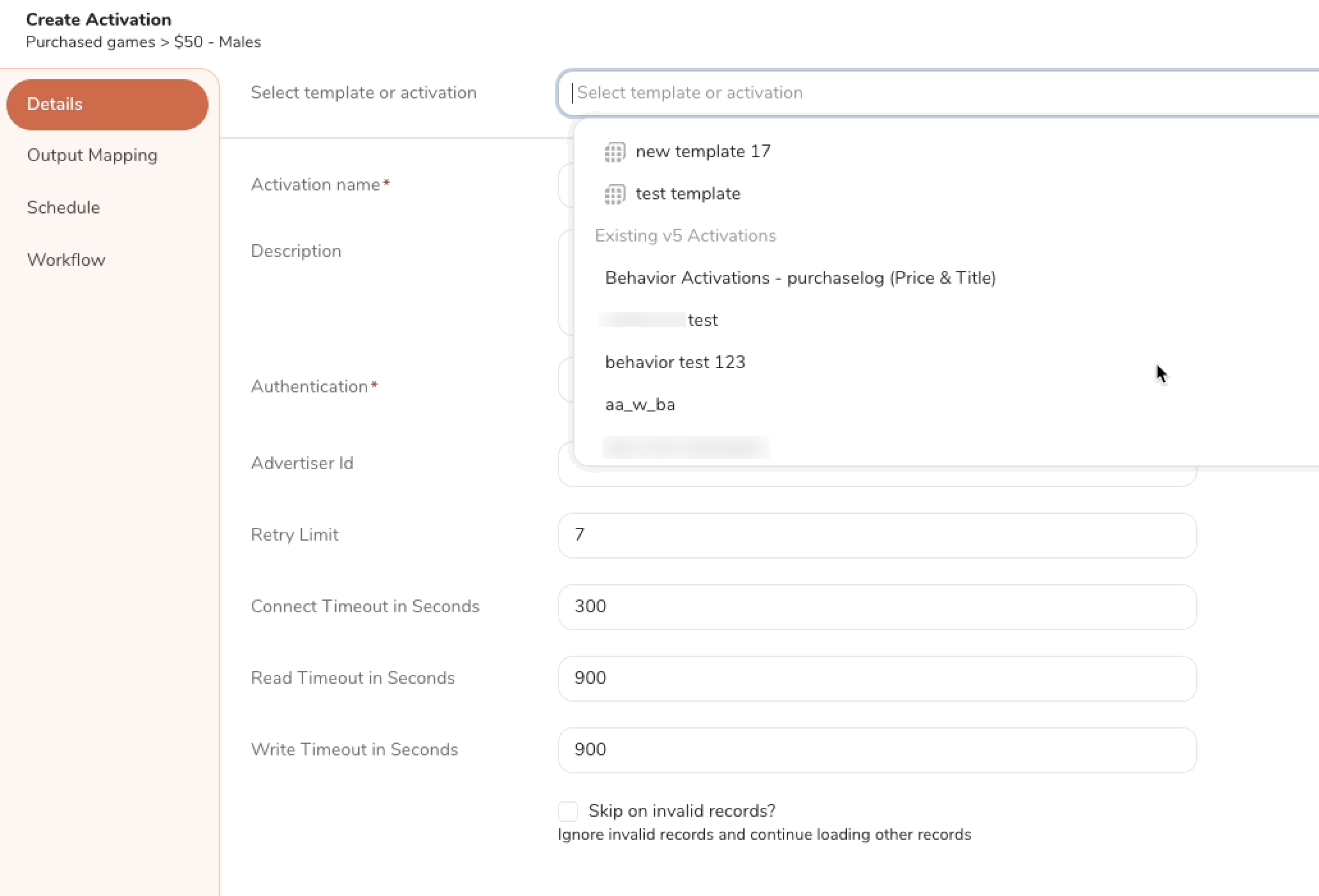 Fill Details as applicable. When selecting a template or activation, you can scroll the list to use Activation Templates or Existing v5 Activations.