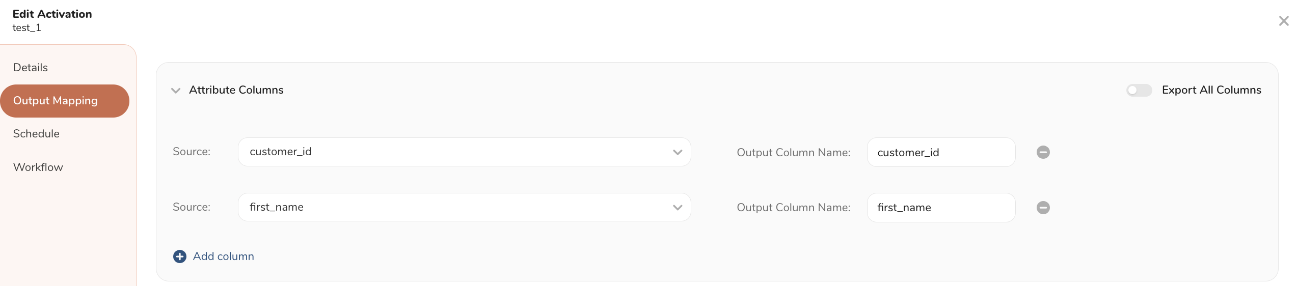 Select Order by to specify the column and configure order of the output table. For details on order and row-column formatting, see Customize Activation Output.