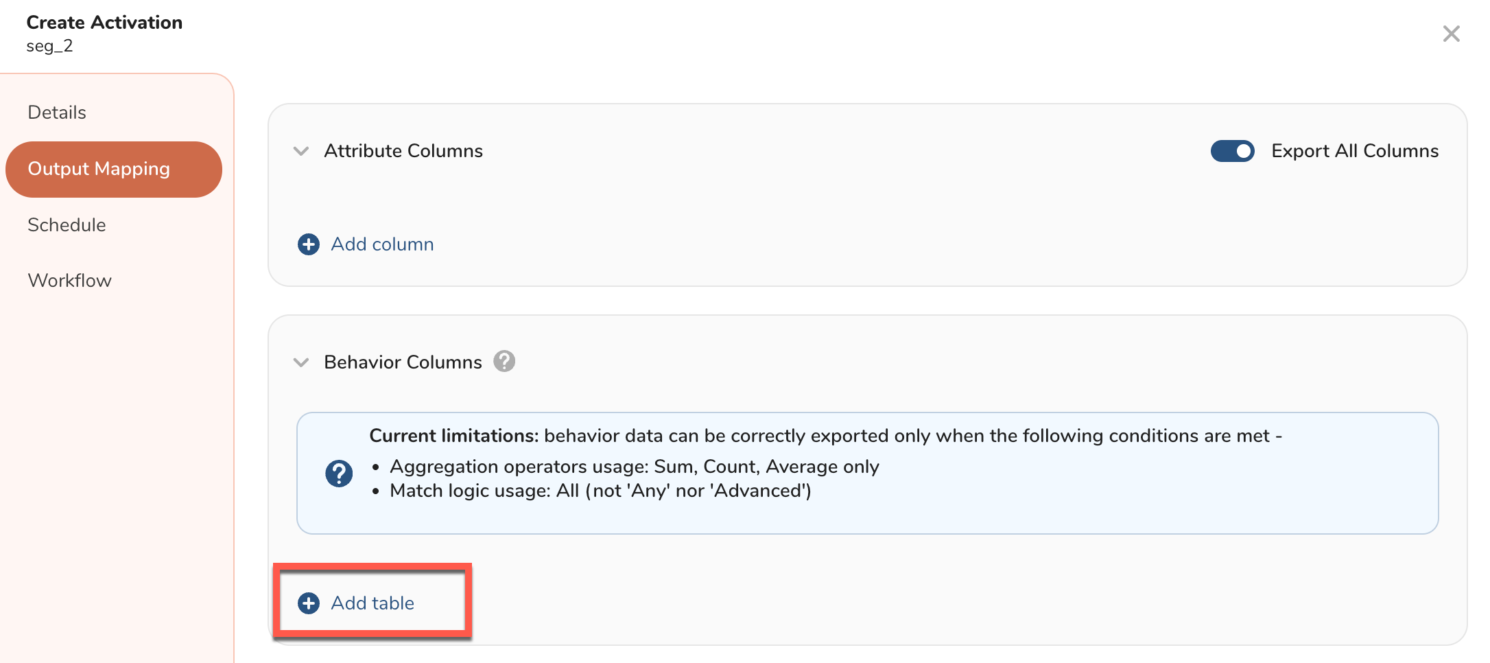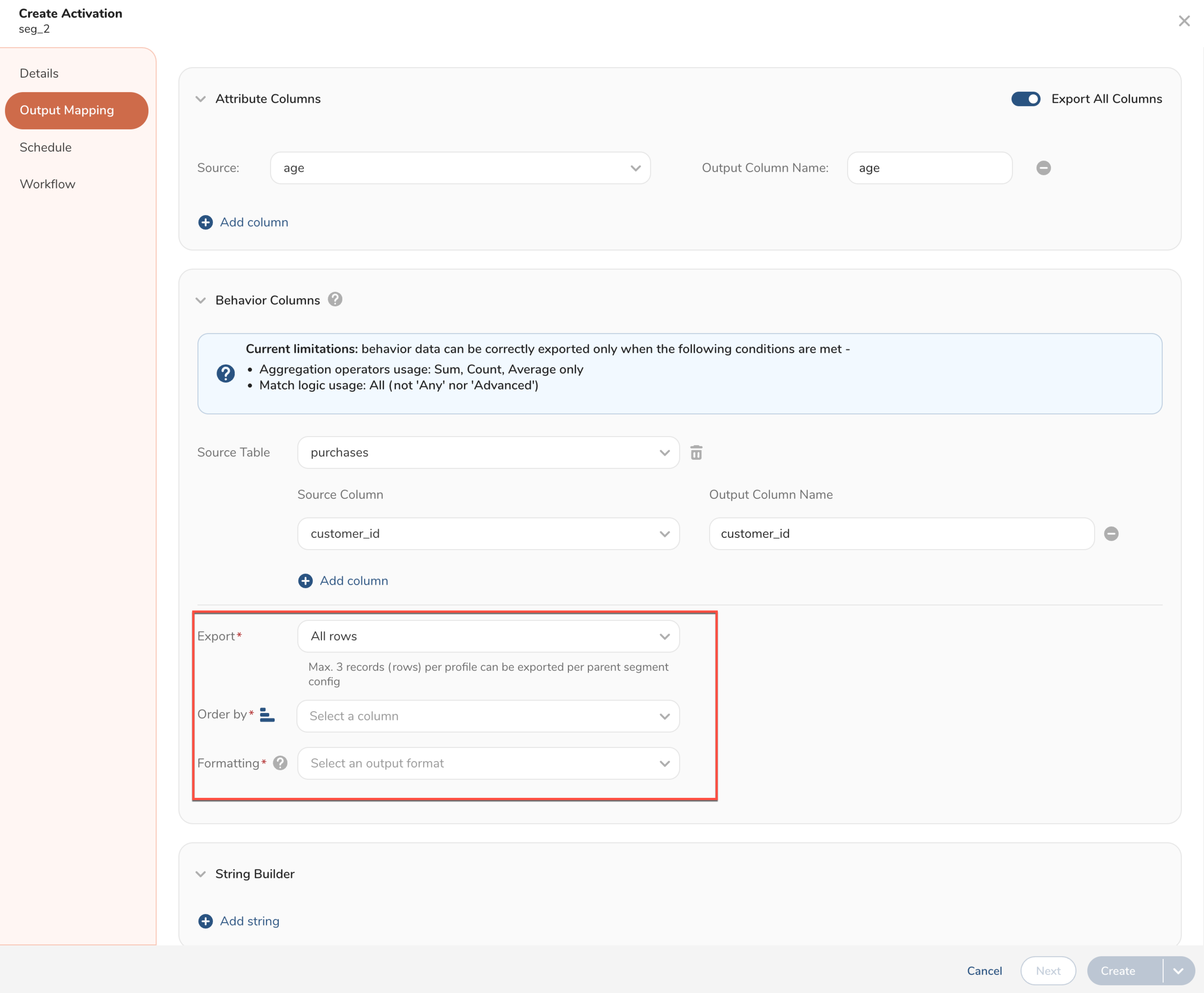 (Optional) You can add columns if needed using String Builder. This allows custom text to be added that can help track or associate activations to specific segments, campaigns, or datetime. For details, see string builder.