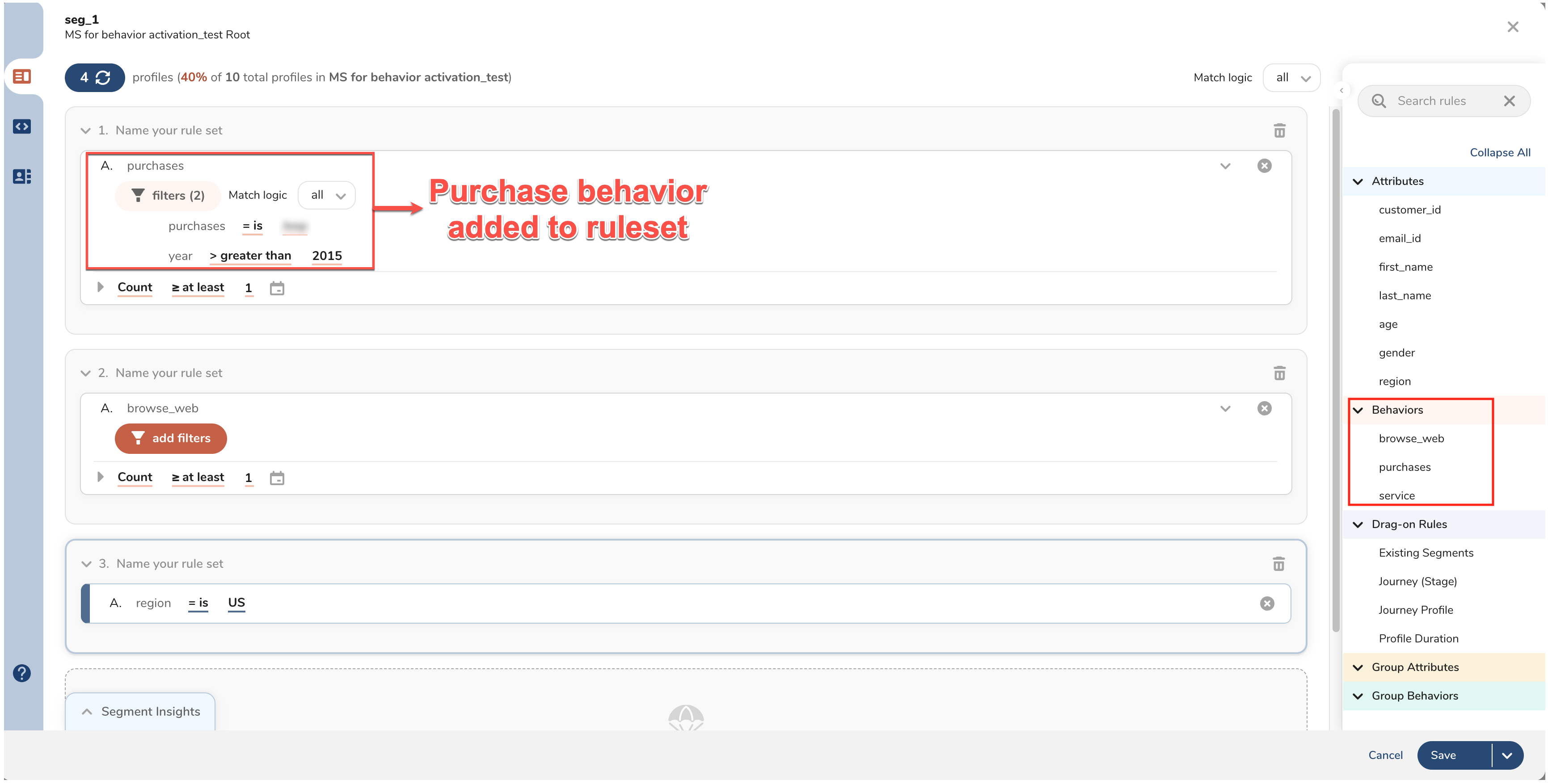 - Create a new segment with segment rules that is configured to select behavior data. For details, see Segments Overview. The following screenshot shows a segment that selects purchase behavior among others.