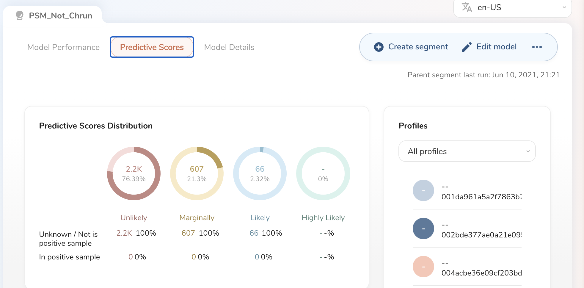 - Select Predictive Scores. Predictive scores data are generated and updated only after a successful parent segment run.