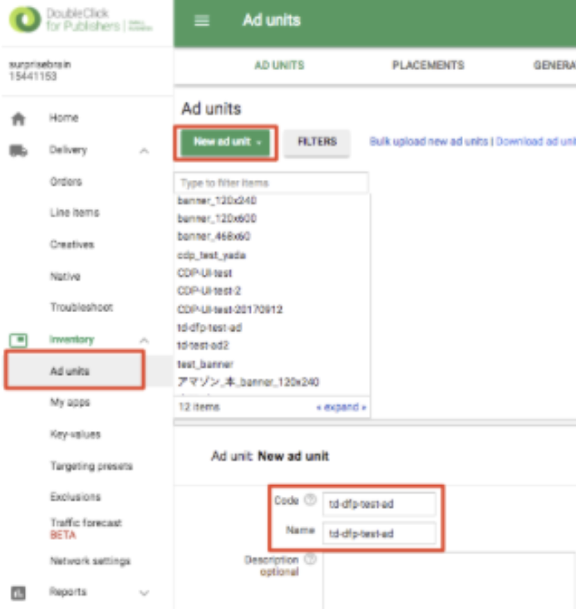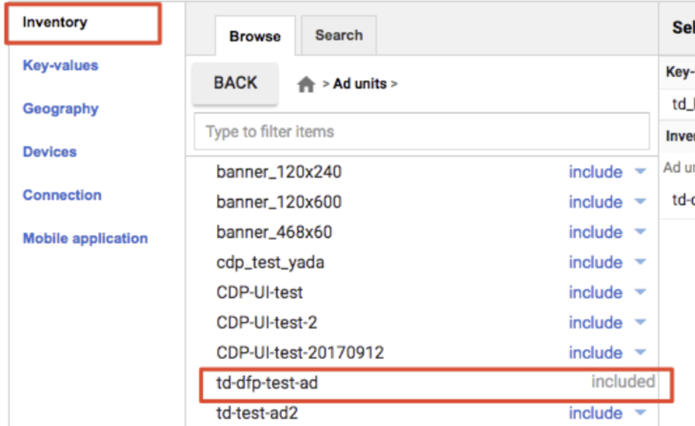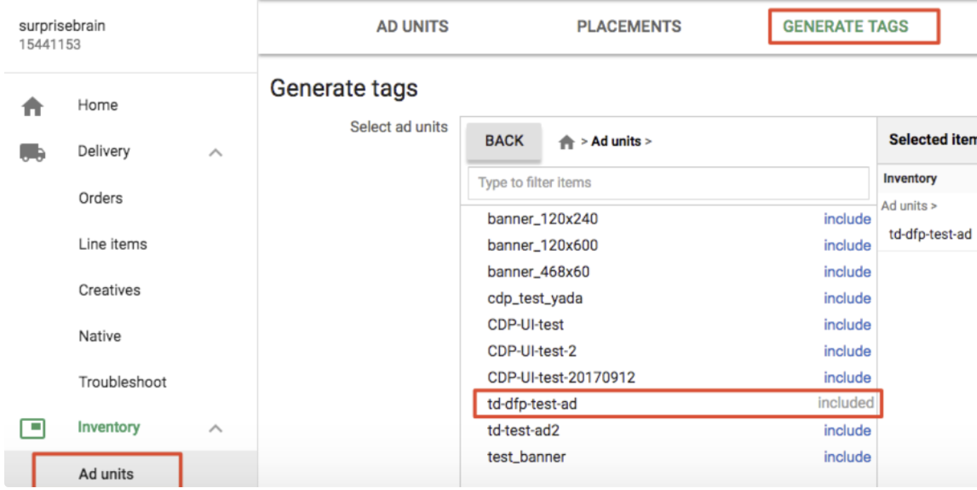 - Select the advertising units that you created. For example, td-dfp-test-ad.