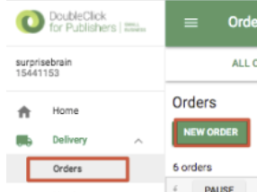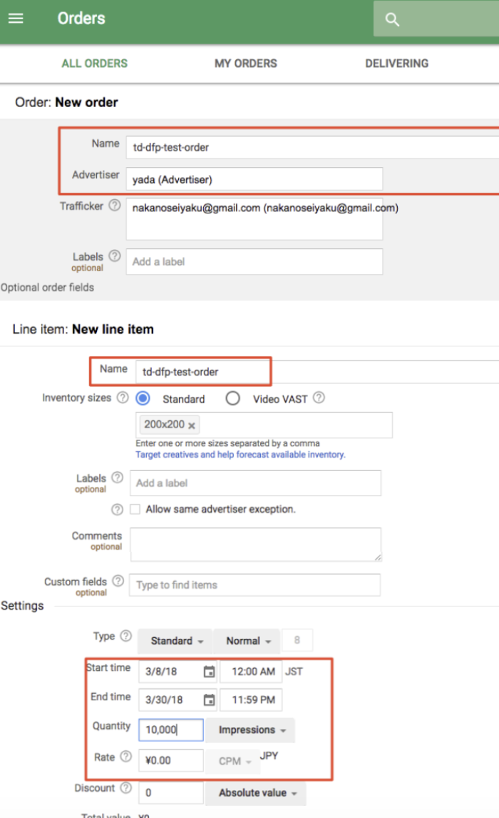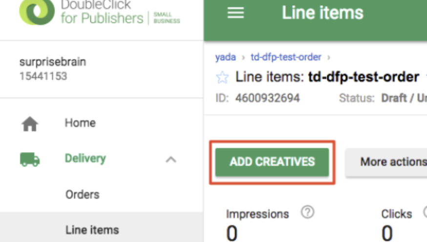 - Select the advertisement unit that you created. For example, td-dfp-test-ad. An order object is created. For example: