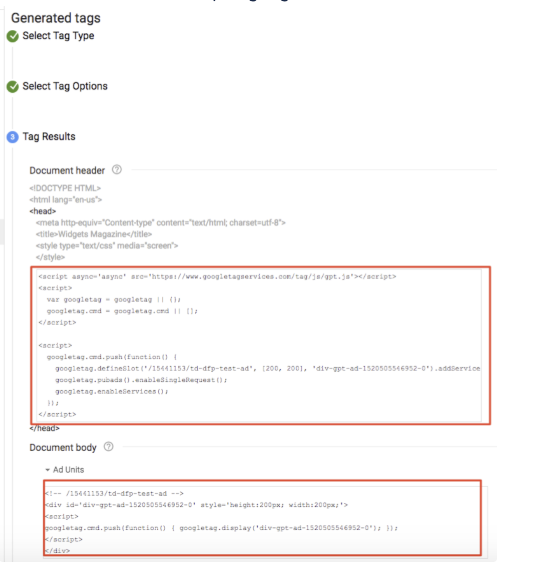 For example, the following HTML contains the integration code between DFP JavaScript Tag and TD JavaScript Tag.