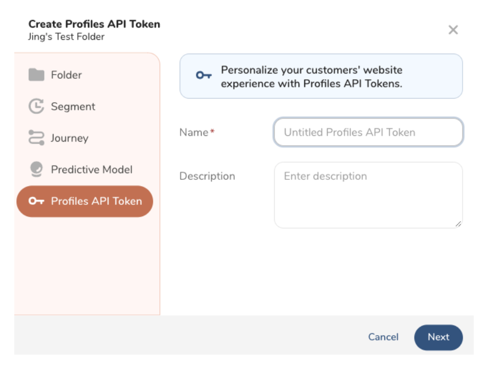 - Navigate to Audience Studio > Folder > Profiles API Token.