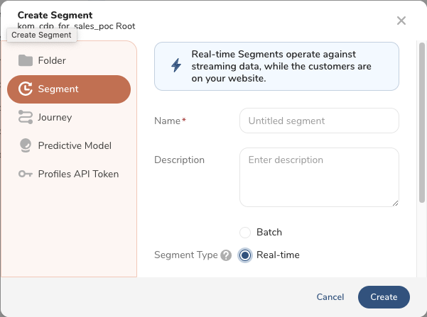 - The Create New dialog opens. Select Segment. Select Real-time for Segment Type.
