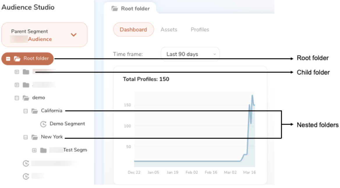 Each Parent Segment contains a root folder. A root folder can contain one or more child folders. Child folders can contain nested folders, and so on.