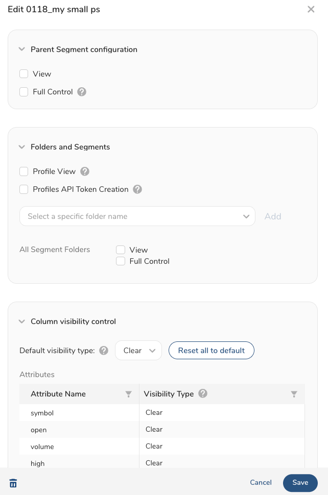 Users can be assigned either View permission or Full-control permissions to a folder. That permission applies to every entity included in a folder, regardless of entity type (for example, segment, funnel, predictive scoring, and so on).