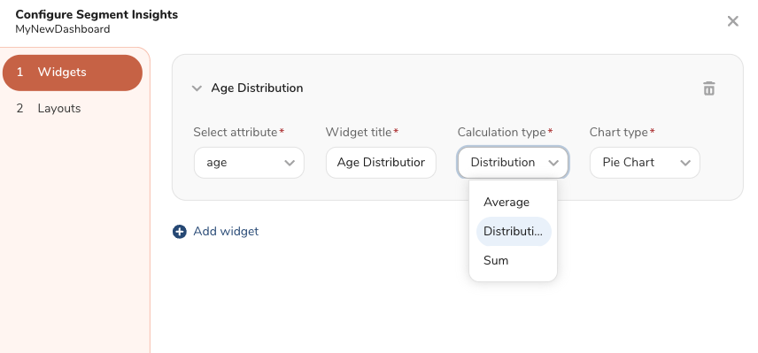 You can begin to define the new widget in your dashboard by selecting its attribute, giving it a title, and selecting its calculation and chart types, where applicable.