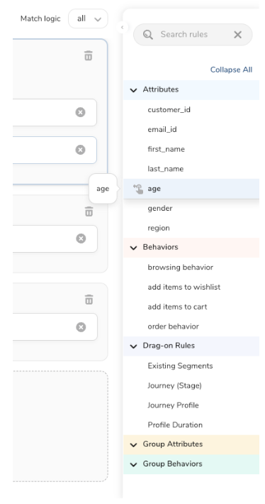 The ability to drag and drop rules from an easy-to-see list of attributes and behaviors greatly enhances the user experience. Additionally, existing segments and journey stages can be easily reused. Rules can also be moved around within a rule set or from one ruleset to another within the same segment, giving the user greater flexibility.