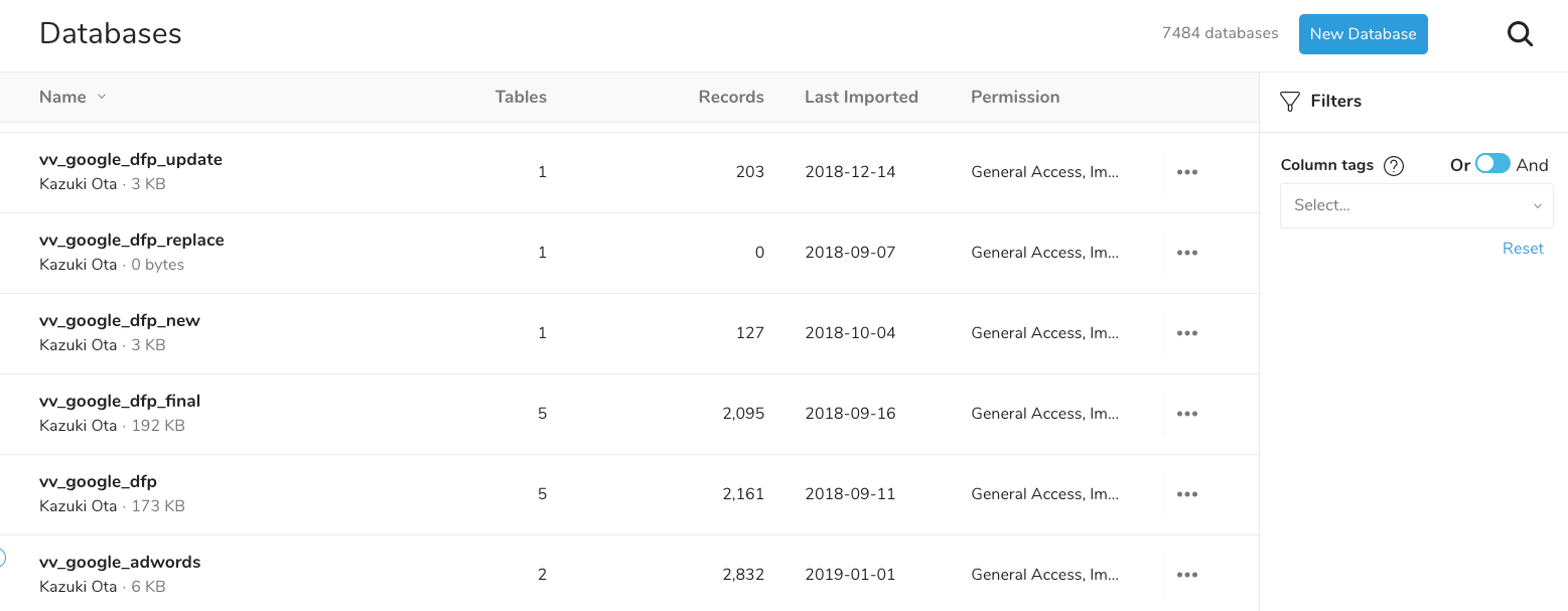 Quickly review databases for your account, the number of tables, records, the last imported date, and general permissions.