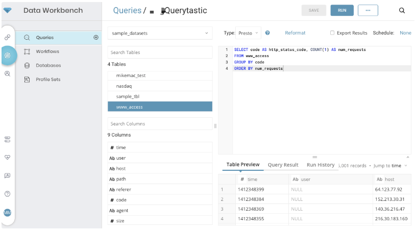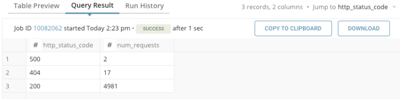 Write a query of your choice against the table named "www_access". Here is one example query that counts and sorts HTTP requests by their status codes.