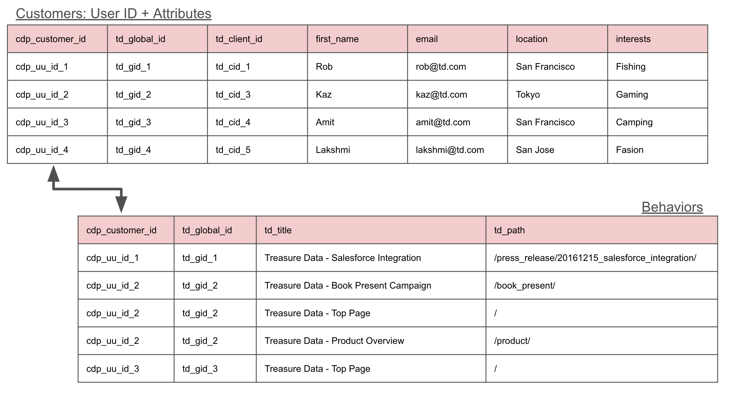 Attributes and behaviors are often linked by a common ID (typically the td_global_id or Customer ID).