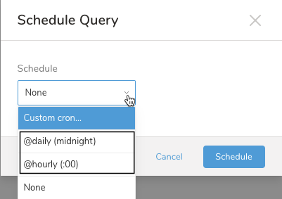 @hourly (:00). Schedule an hourly query with a specific time zone. Optionally, choose to delay execution.