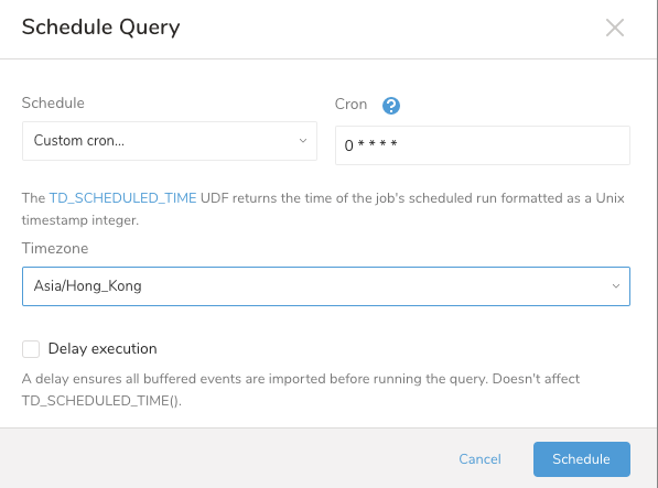 You can run a query immediately, or schedule it for later. Treasure Data supports the following schedules for queries: