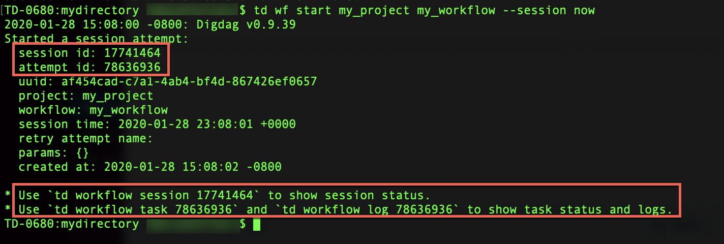 You can check the status of your workflow sessions, tasks, or logs using the ID provided in the CLI.
