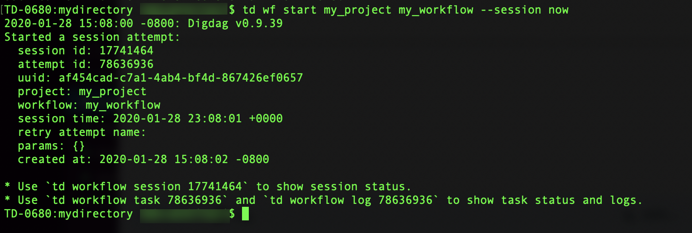 td wf start my_project my_workflow --session nowThe command begins the session and displays session attempt details, including commands to check the status of your session.