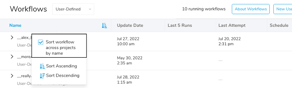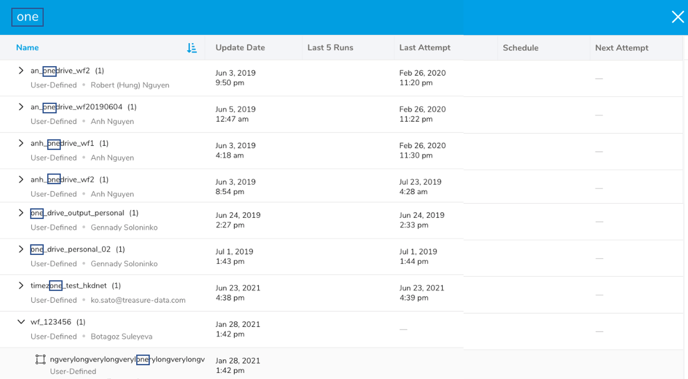 When you first open the workflow landing page, Treasure Data displays projects in a tree structure with the associated workflow(s). To search for a workflow, you can open each project and view the workflows. Optionally, you can search for a workflow.