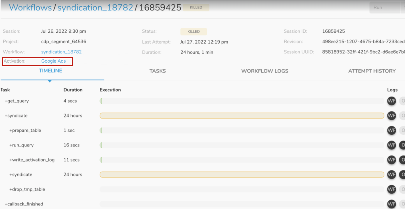 You might have a workflow that has been running for a long time or one that has failed. You can easily access the activation that launched the workflow from the workflow page.