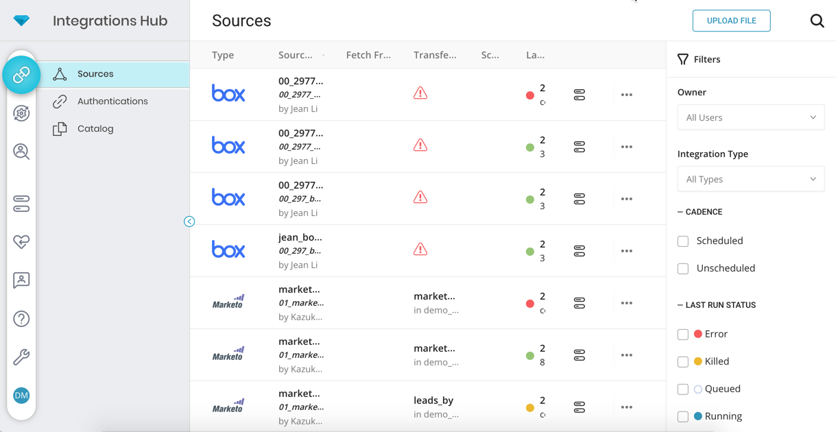 In Sources, you can view and edit your data sources and connections. Specify where to pull data from a connector and where to land it in Treasure Data, or upload CSV/TSV files for ingestion.