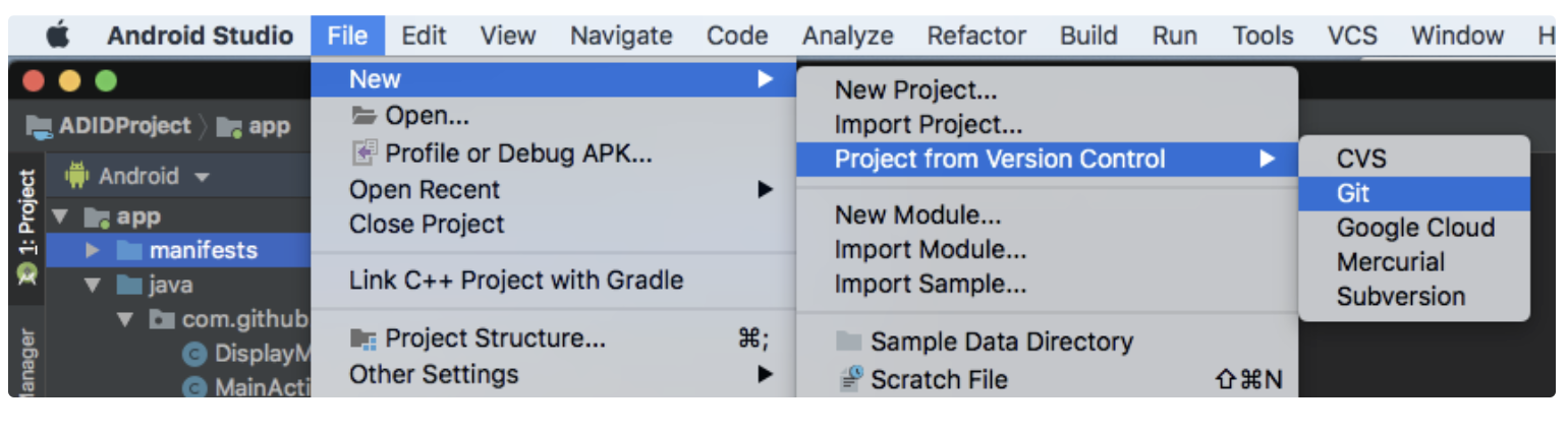 Choose File > New > Project from Version Control > Git.