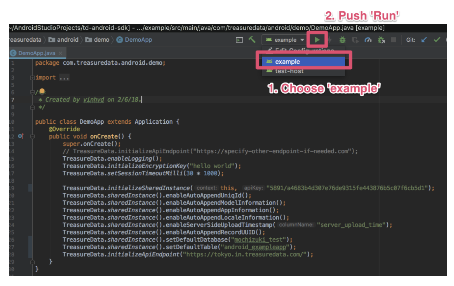 TreasureData.initializeApiEndpoint("https://tokyo.in.treasuredata.com/");To run the sample app in the emulator, you need to create a virtual device first.