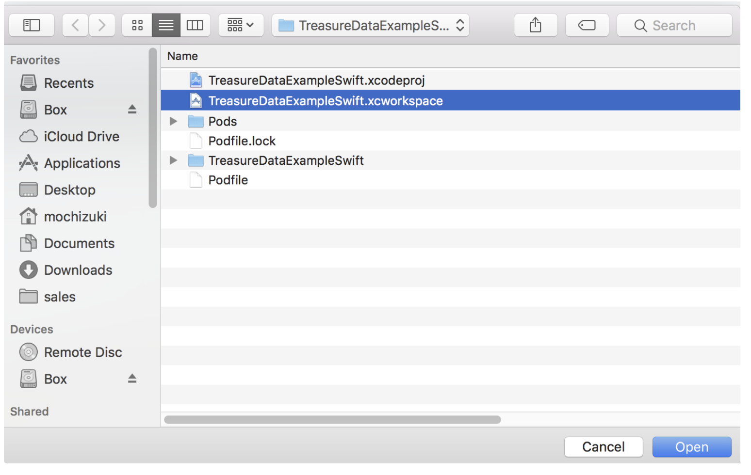 Select the TreasureDataExampleSwift.xcworkspace file, not TreasureDataExampleSwift.xcodeproj.