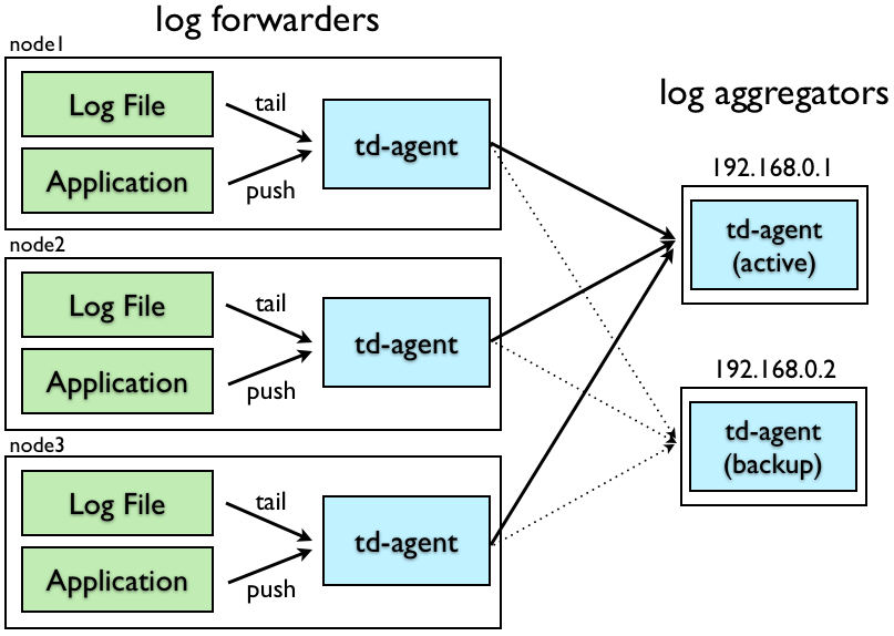 td-agent can act as either a log forwarder or a log aggregator, depending on its configuration. The following information describes the setups. We assume that the active log aggregator has an IP address ‘192.168.0.1’ and that the backup has an IP address ‘192.168.0.2’.
