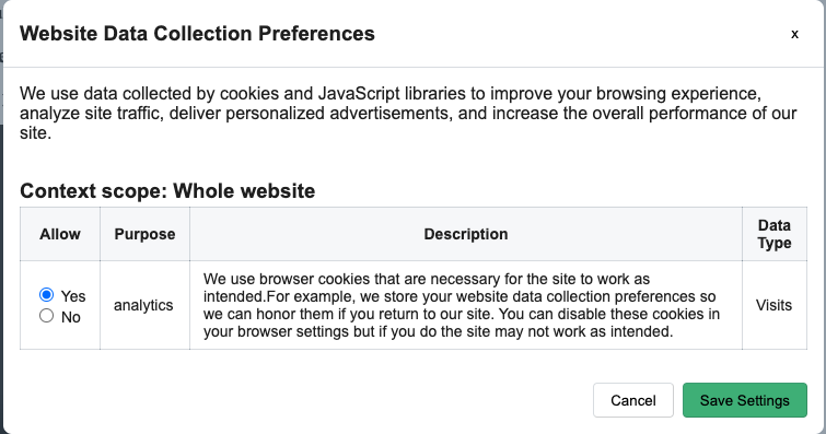 A small overlay displays at the top of your website to let users know that the website is using cookies (and other similar technologies) to collect data for improving user experiences. Users can choose to adjust their preferences as they want.