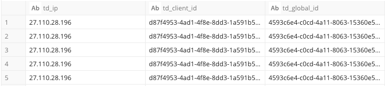 select td_ip,td_client_id,td_global_id from <db name>.<tbl name>