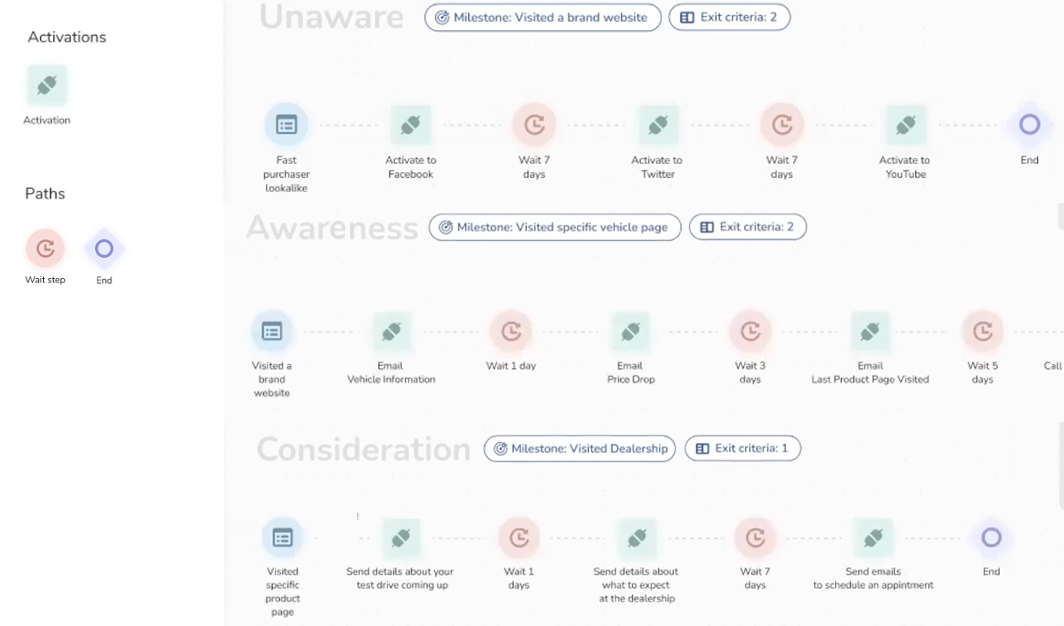 Each journey can have up to eight stages. After marketers create journey stages, they can further analyze and refine them and activate specific campaign stages.