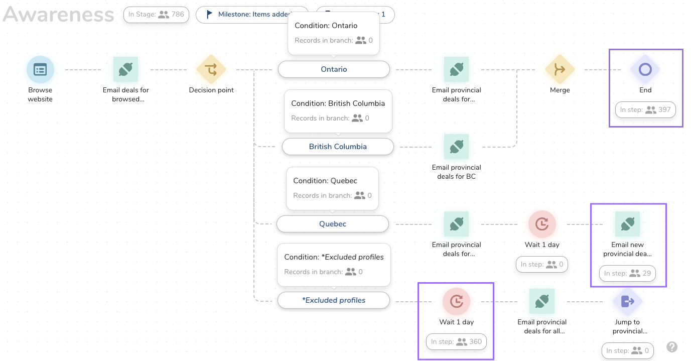 In this example, we'll look at the journey's first stage and focus on how decision points affect profile progress.