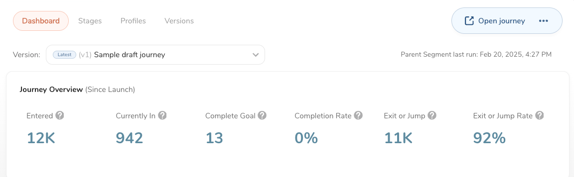 Statistics for each chart are calculated based on the parent segment refresh. Batch journey statistics show a daily count of where profiles are in the journey. Learn more about Batch Journey Workflow Dependencies.