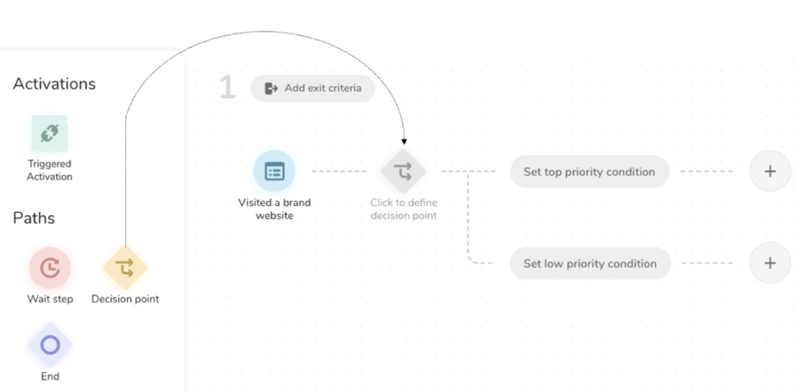 - In the left panel, select Decision Point and drag it to the Journey Canvas.