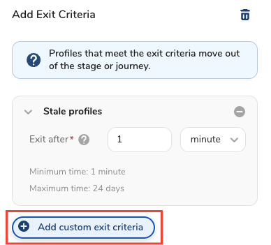 - Stale profiles : Profiles that meet exit criteria move out of the stage or journey. You can also add custom exit criteria with stale profile conditions.