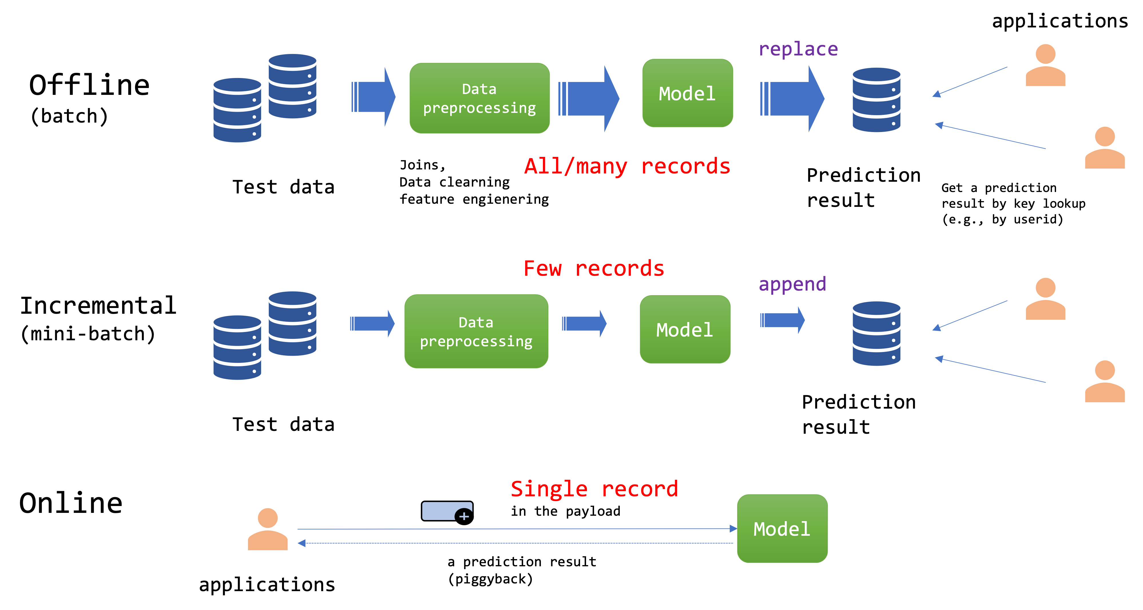 - Incremental (mini-batch) prediction: Similar to batch prediction with the difference that tasks can be split into smaller batches. It can take seconds to minutes to complete each mini-batch of prediction. It can not be applied for strict real-time requirements but can be applied for semi-realtime scenarios where a few minutes' latency is acceptable.
