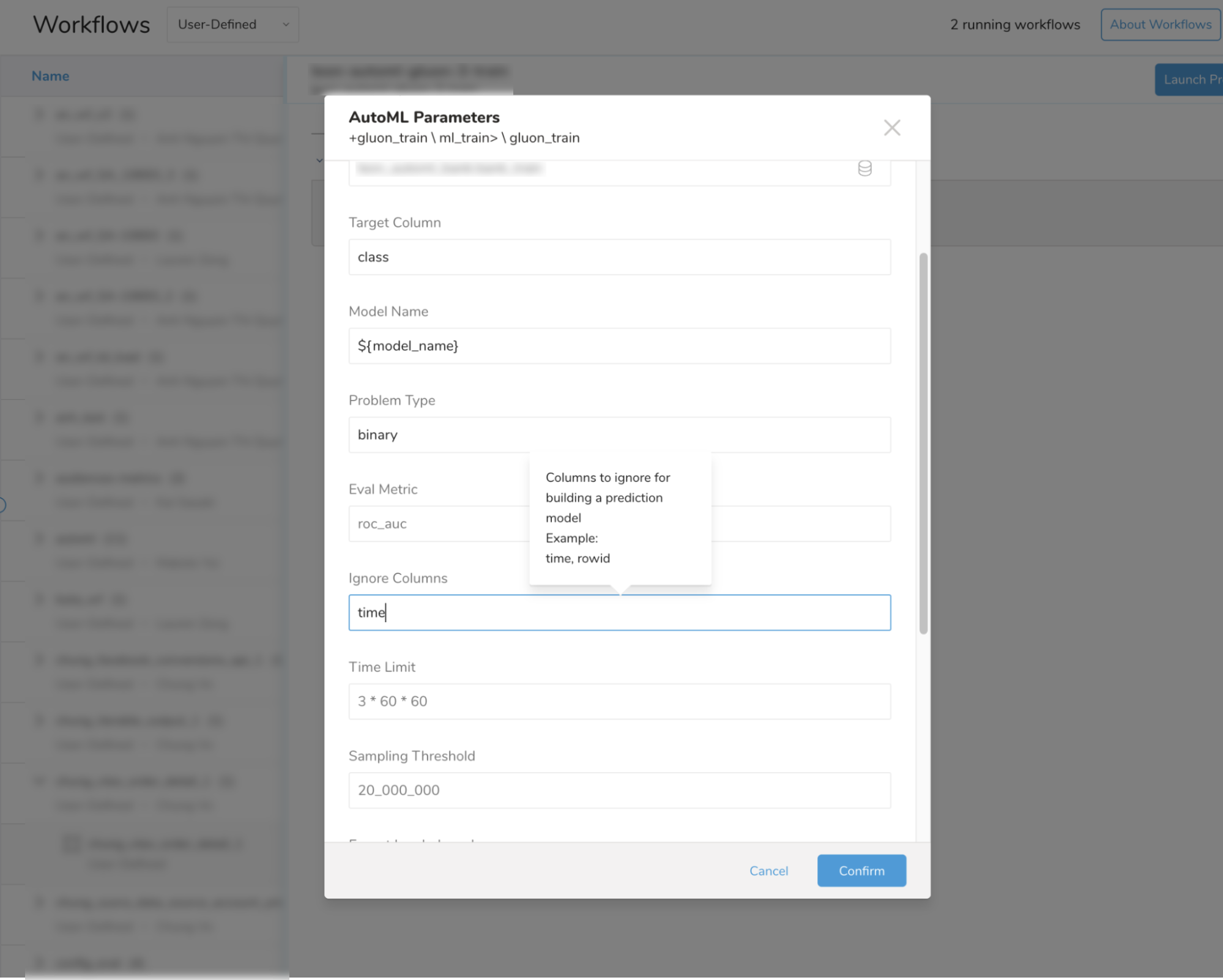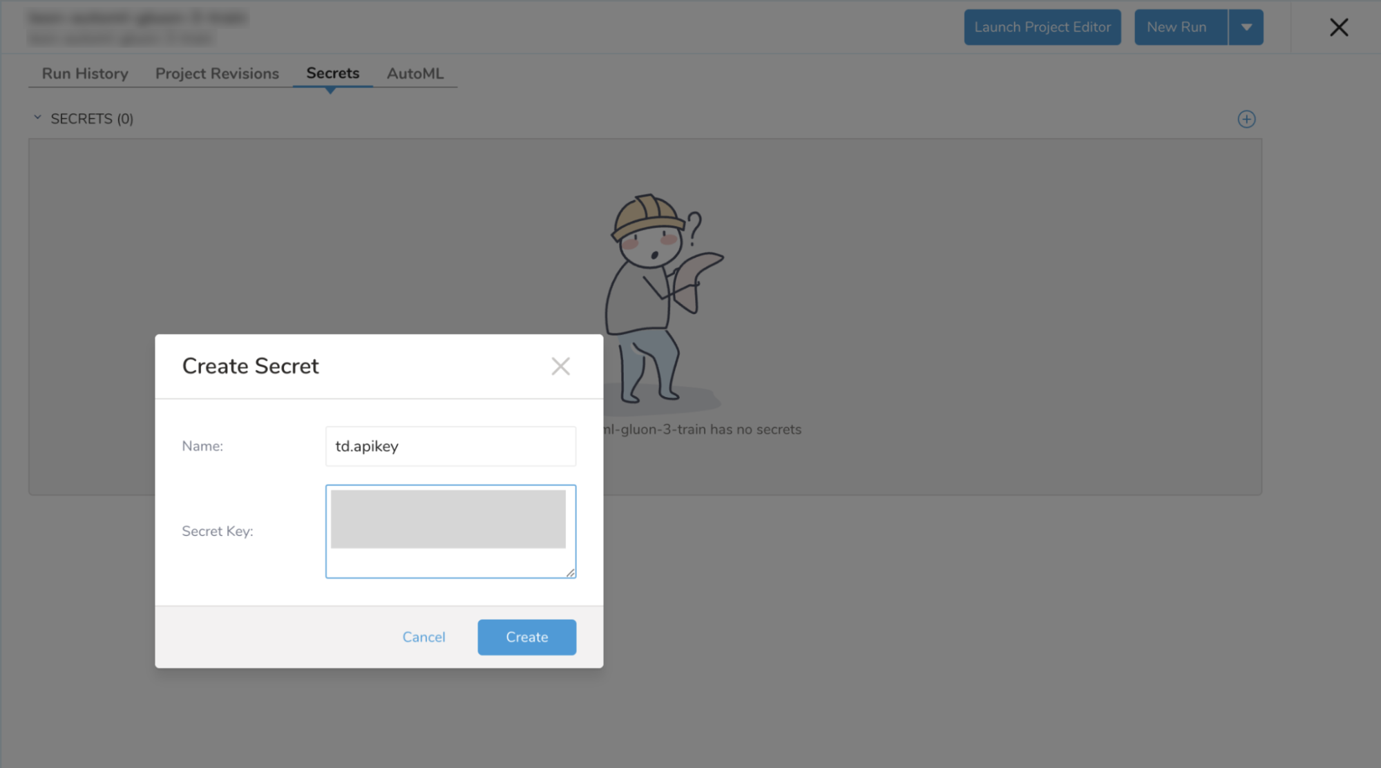To prepare the AutoML workflow, it is necessary to provide a Master Key as a secret. This is required to enable the AutoML container to access relevant databases. You can set and edit secrets or parameters for an AutoML Workflow from the console, like a typical TD workflow.