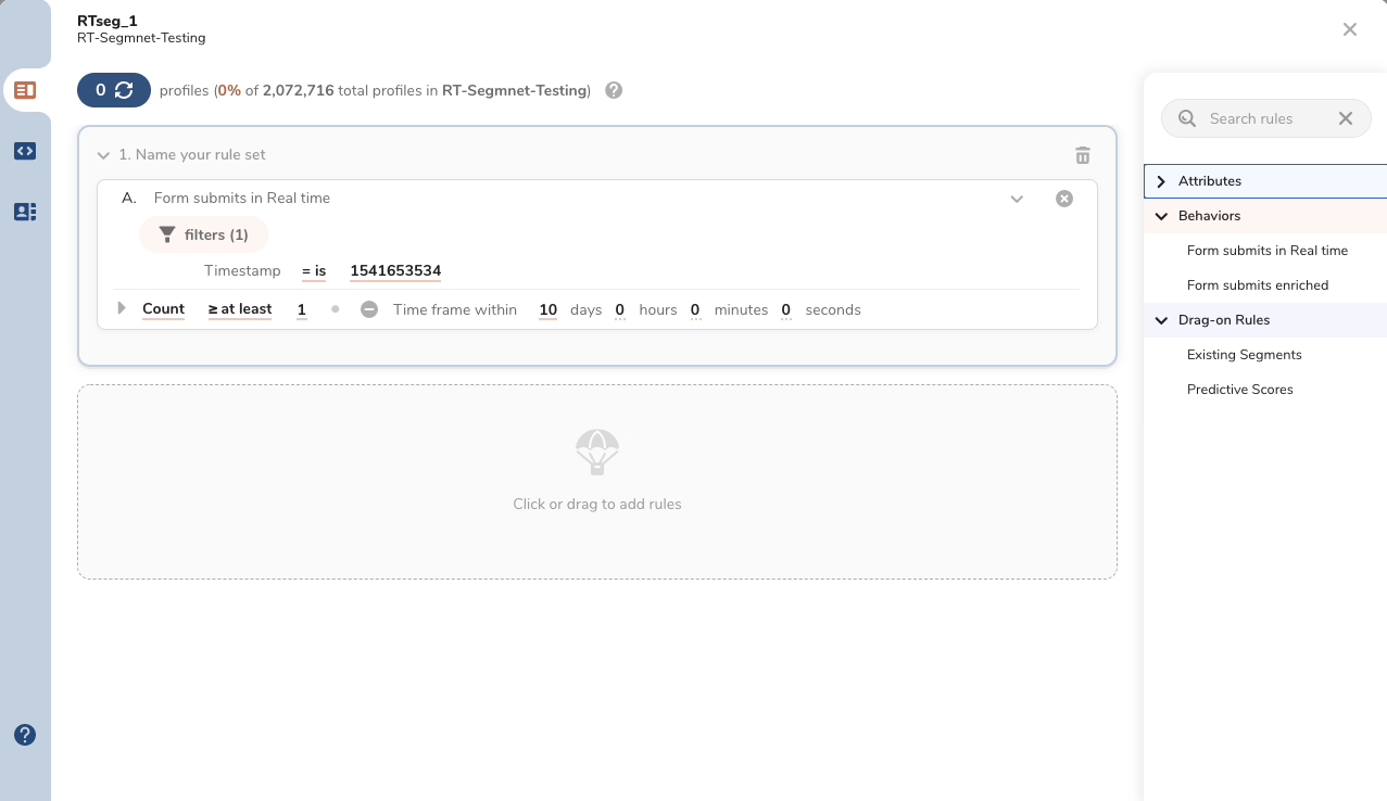 After creating a segment, you can create rule sets to refine the segment, including drag-on rules (Drag-on rules must be enabled in the parent segment). Individual rules are categorized by Attributes, Behaviors, Existing Segments, and Predictive Scores. Unlike batch segments, you are not able to access Funnels and A/B Testing. Additionally, you cannot create activations from a real-time segment.