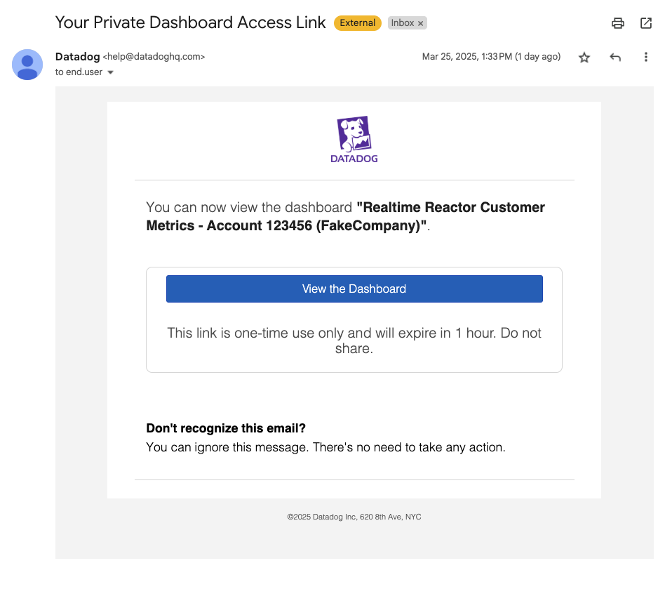 If you have one of the provided emails, you will receive an email from Datadog with the title Your Private Dashboard Access Link. In the email it will say something like ‘You can now view the dashboard “Real-Time Monitoring - Account [YOUR ACCOUNT NUMBER] ([YOUR COMPANY NAME])”. Verify that this information matches with your setup.