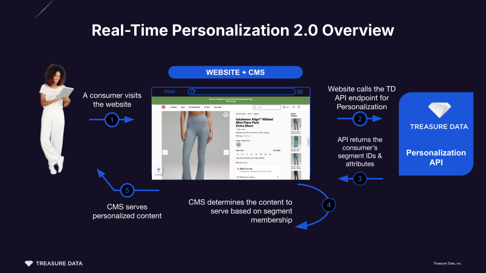 Unlike traditional server-side personalization—which routes every request through an intermediary backend—client-side Real-time Personalization 2.0 allows JavaScript running in the user’s browser to securely fetch personalization payloads from Treasure Data’s API, eliminating extra network hops and reducing latency. This approach unlocks rapid UI updates and enables powerful in-page personalization scenarios—such as showing targeted offers, product recommendations, or loyalty banners as soon as the user lands or interacts with your site.