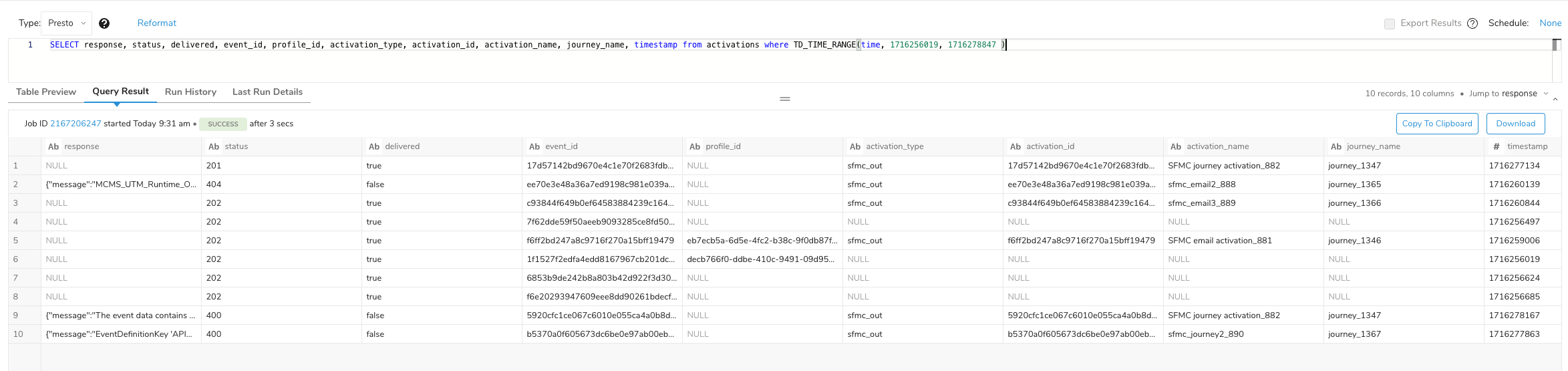 SELECT response, status, delivered, event_id, profile_id, activation_type, activation_id, activation_name, journey_name, timestamp from activations where TD_TIME_RANGE(time, 1716256019, 1716278847 ) SELECT response, status, delivered, event_id, profile_id, activation_type, activation_id, activation_name, journey_name, timestamp from activations where TD_INTERVAL(time, '-3d/now') SELECT * from activations where TD_TIME_RANGE(time, '-12h')