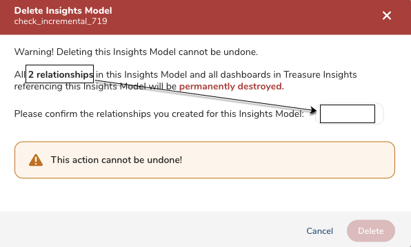 - To confirm your deletion of the Insights model, type the number of relationships in the box and then select Delete.