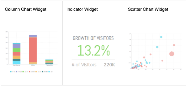 A widget is a dynamic visualization of data. When you create a widget, you select the type of data to display and the type of visualization (chart type). You can add multiple widgets to your dashboards.
